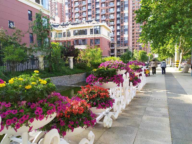 为了打造好花漾街区和花景大道,章丘区园林和林业绿化局精心设计了美化彩化方案,在百脉泉街景观河道13座汉白玉桥梁两侧栏杆上进行桥体挂花,道路西侧设置龙纹祥云花架15个,共种植一串红、垂吊牵牛、万寿菊约6000株,流水潺潺的河道上点缀的26条绚丽的花带使老街道重新焕发了生机与活力;今春在石河街和胡山大街种植白蜡、海棠、月季花等乔木和花灌木7800余株,种植鸢尾、萱草、紫萼等地被植物共计20万株,增加了道路的季相变化,在开先大道设置景观花树10个、拱形花架10个,种植矮牵牛、金盏菊、红叶海棠、小丽花等花卉2万株,福禄考7万株,四条道路除胡山大街外其余道路已打造完成。该部门目前还在陆续打造经十东路、双山大街等花景大道,种植金叶榆、大叶女贞、红枫、欧石竹等季相变化明显的彩叶树种和地被植物,丰富道路绿化的层次感和色彩感。通过绿化提升,一街一景,一路一品,繁花似锦,道路颜值更靓丽多彩,色彩斑斓、花期延绵的道路绿带花境景观凸显,进一步提升了城市环境品质。
