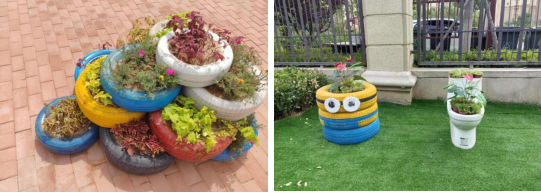 在这里,旧轮胎的再生成为一大亮点,将回收轮胎切割重组,彩绘为彩虹色螺旋花盆群,层叠种植波斯菊、矮牵牛等低维护开花植物,形成高低错落的“轮胎花塔”,赋予废旧材料新生机,传递环保价值观。