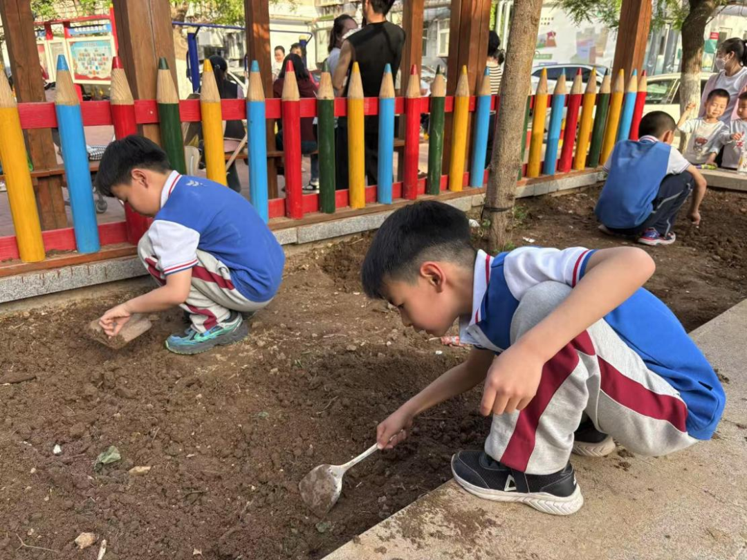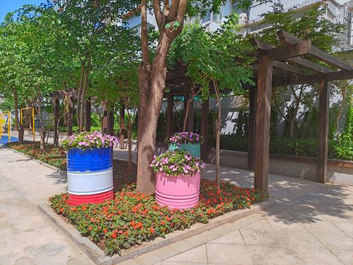 在洪家楼街道花园中区共建花园的建设过程中,社区组织居民们一起动手,将废旧轮胎、油桶和塑料框变废为宝。活动现场,大家热情高涨,纷纷拿起画笔为这些旧物涂色,赋予它们全新的色彩与活力。随后,居民们又在这些容器里播撒希望的种子,种植上娇艳的花草。