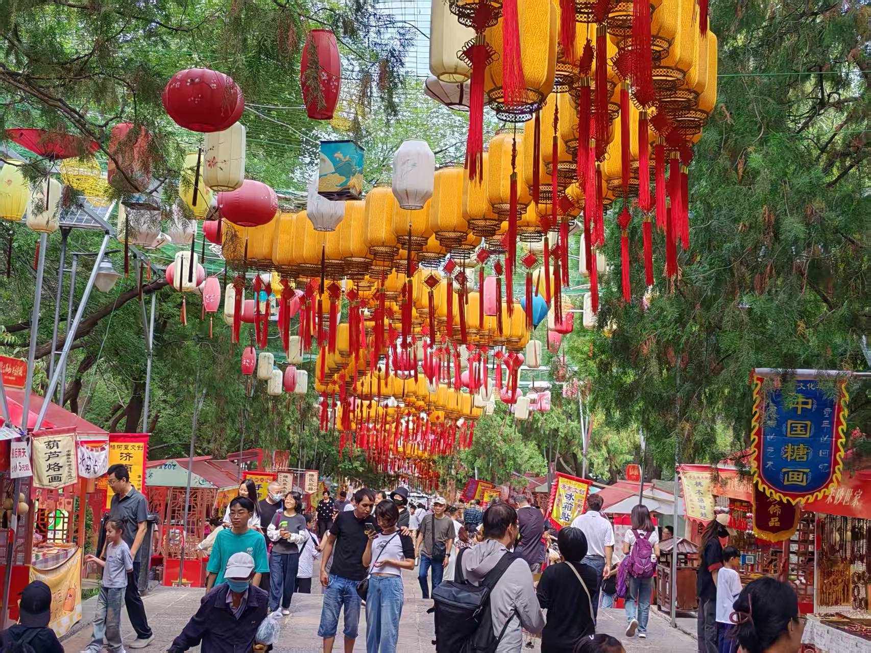 千佛山风景名胜区宛如一片欢乐的海洋。主山路、南门外广场等地的山会市集人气爆棚,“多彩市集”“南门市集” “草坪市集”“千山万福文化广场市集”等4大市集,非遗手造精美绝伦,城市文创独具匠心,特色小吃香气四溢,满足了市民游客多元化的消费需求。主山路、闻韶台等区域的互动展演活动更是点燃了现场气氛。