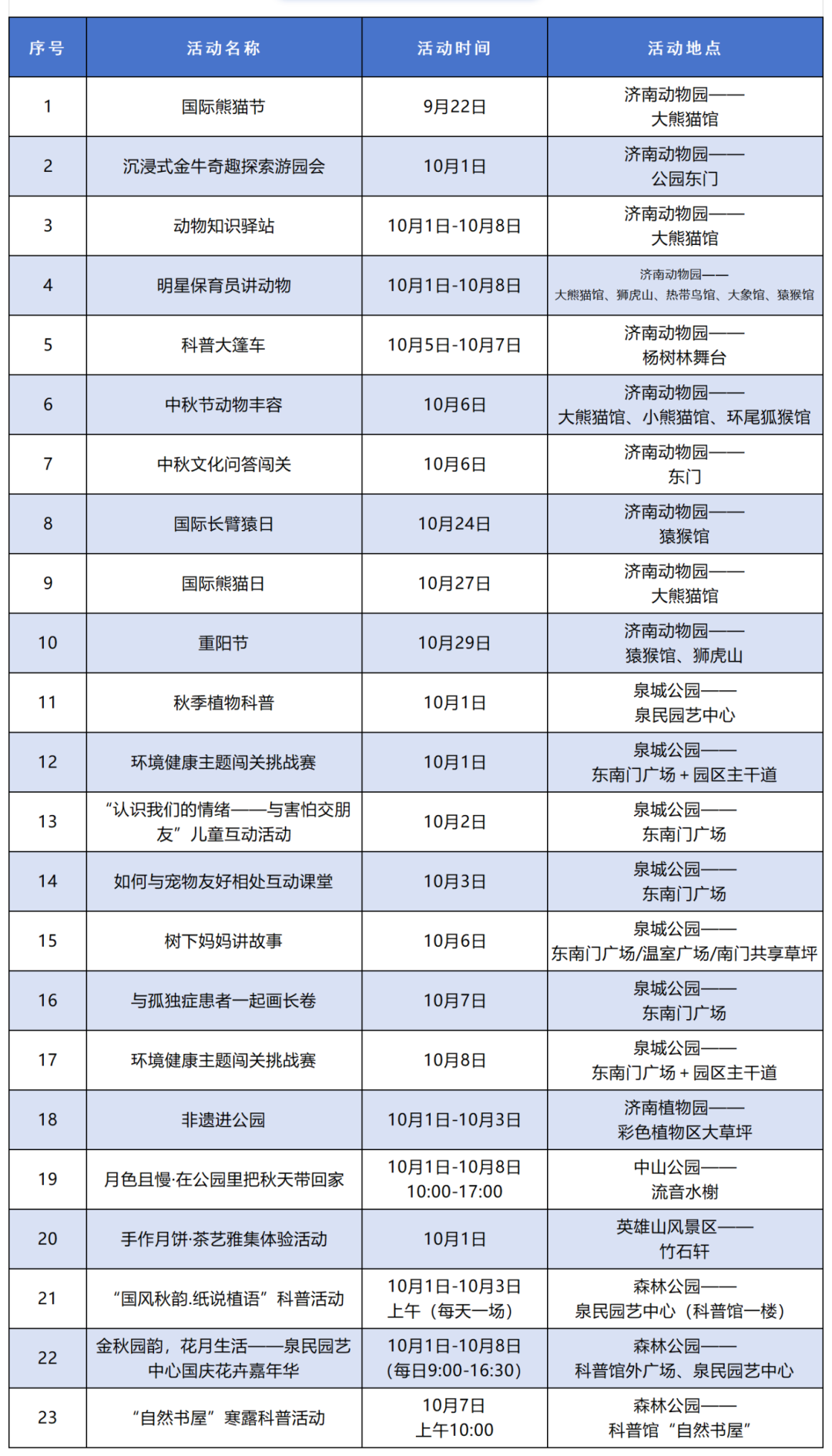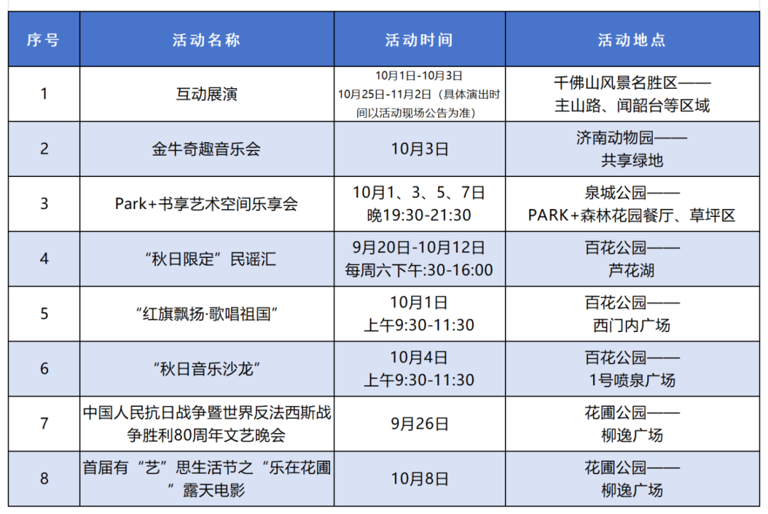金秋九月,泉城济南秋高气爽,泉韵悠长。为丰富市民游客秋日文化生活,济南市公园发展服务中心整合千佛山风景名胜区、济南动物园、泉城公园等9个公园景区特色资源,精心策划2025“泉”在济南享金秋系列活动,为市民游客打造一场集登山健身、文化体验、市集消费、科普教育、艺术展演于一体的秋日盛宴。
