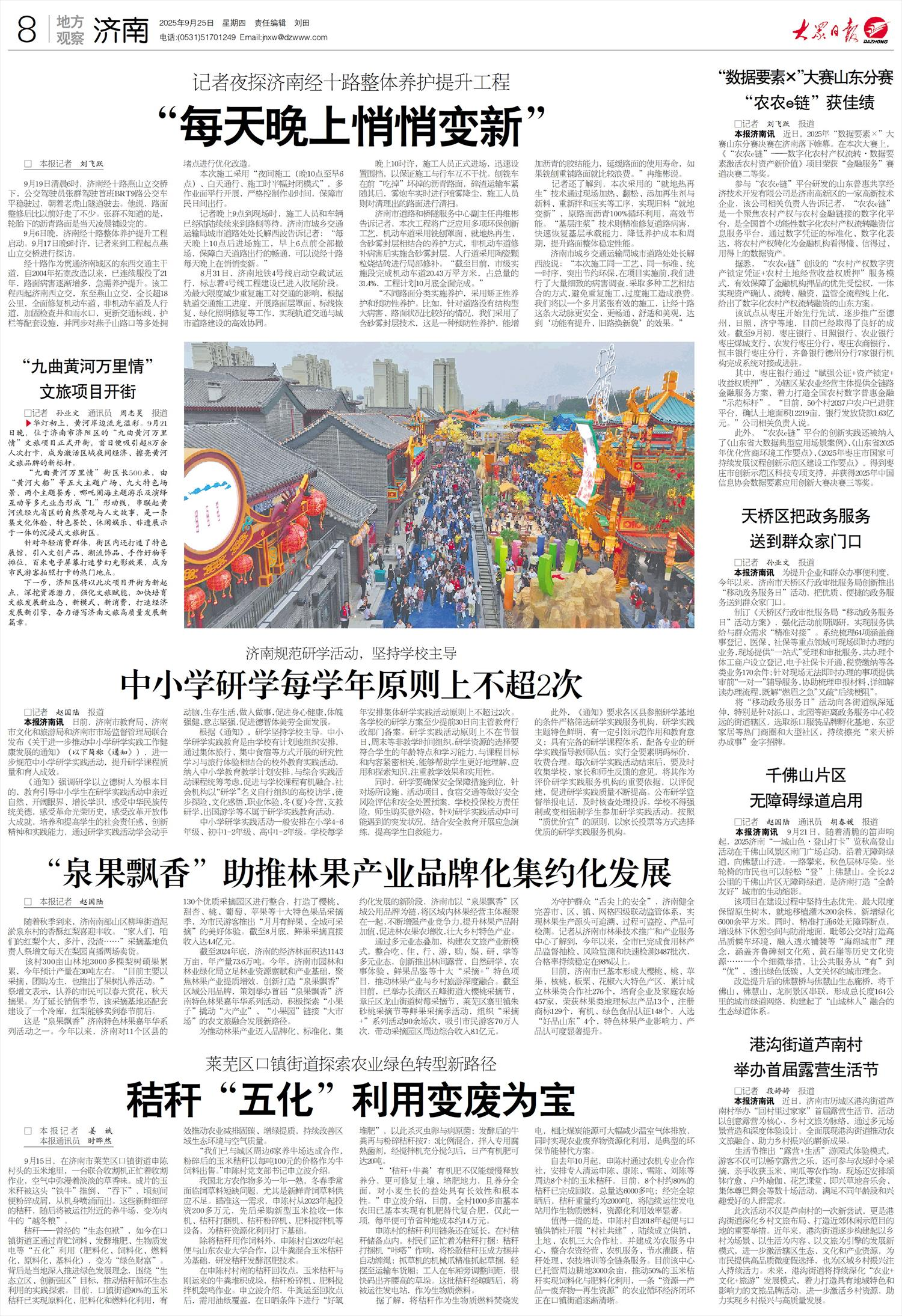 截至2024年底,济南的经济林面积达114.3万亩,年产量73.6万吨。今年,济南市园林和林业绿化局立足林业资源禀赋和产业基础,聚焦林果产业提质增效,创新打造“泉果飘香”区域公用品牌,策划举办首届“泉果飘香”济南特色林果嘉年华系列活动,积极探索“小果子”撬动“大产业”、“小果园”链接“大市场”的农文旅融合发展新路径。