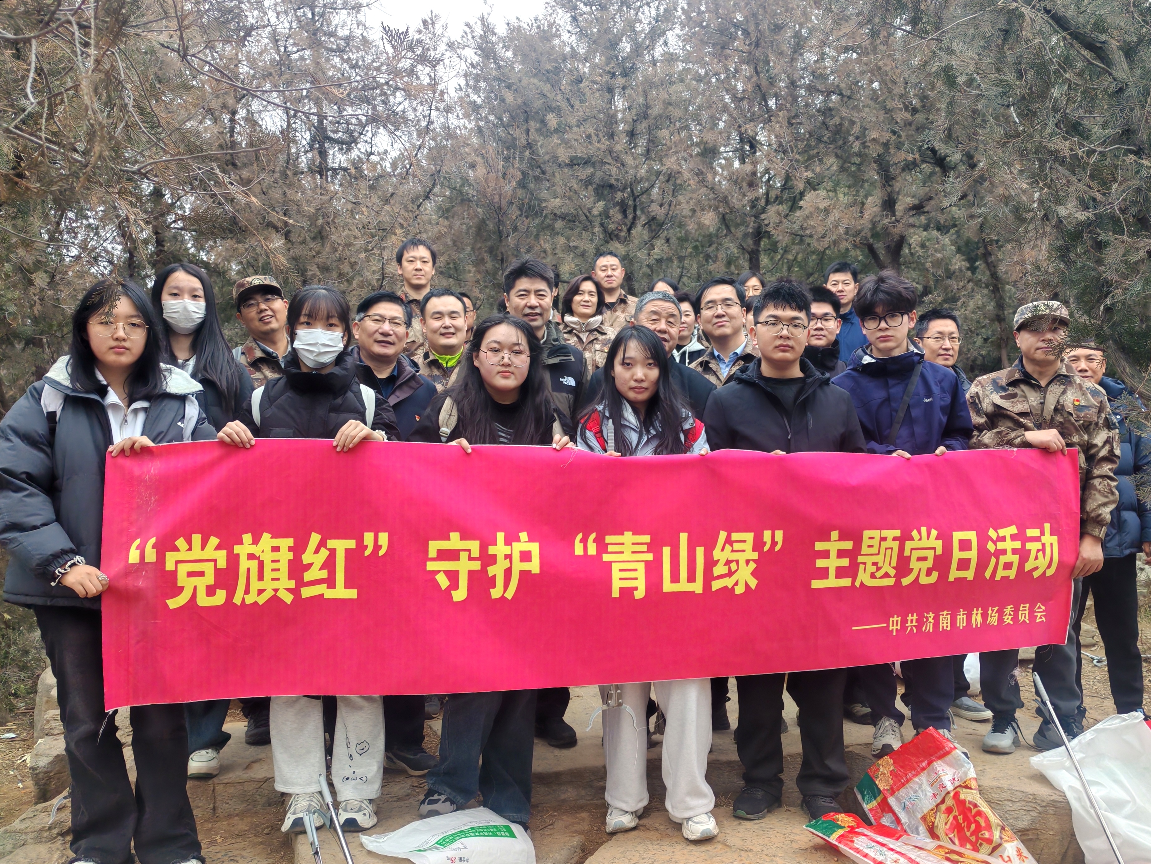 为深入践行生态文明理念,充分发挥基层党组织战斗堡垒和党员先锋模范作用,1月14日下午,市园林和林业绿化局直属机关党委联合市林场党委组织开展了“‘党旗红’守护‘青山绿’”主题党日活动,将党建与业务工作深度融合,以实际行动守护泉城绿色生态屏障。局机关党员代表、林场部分党员、职工、林区带队人员及山东建筑大学大学生志愿者共计30余人参加了活动。