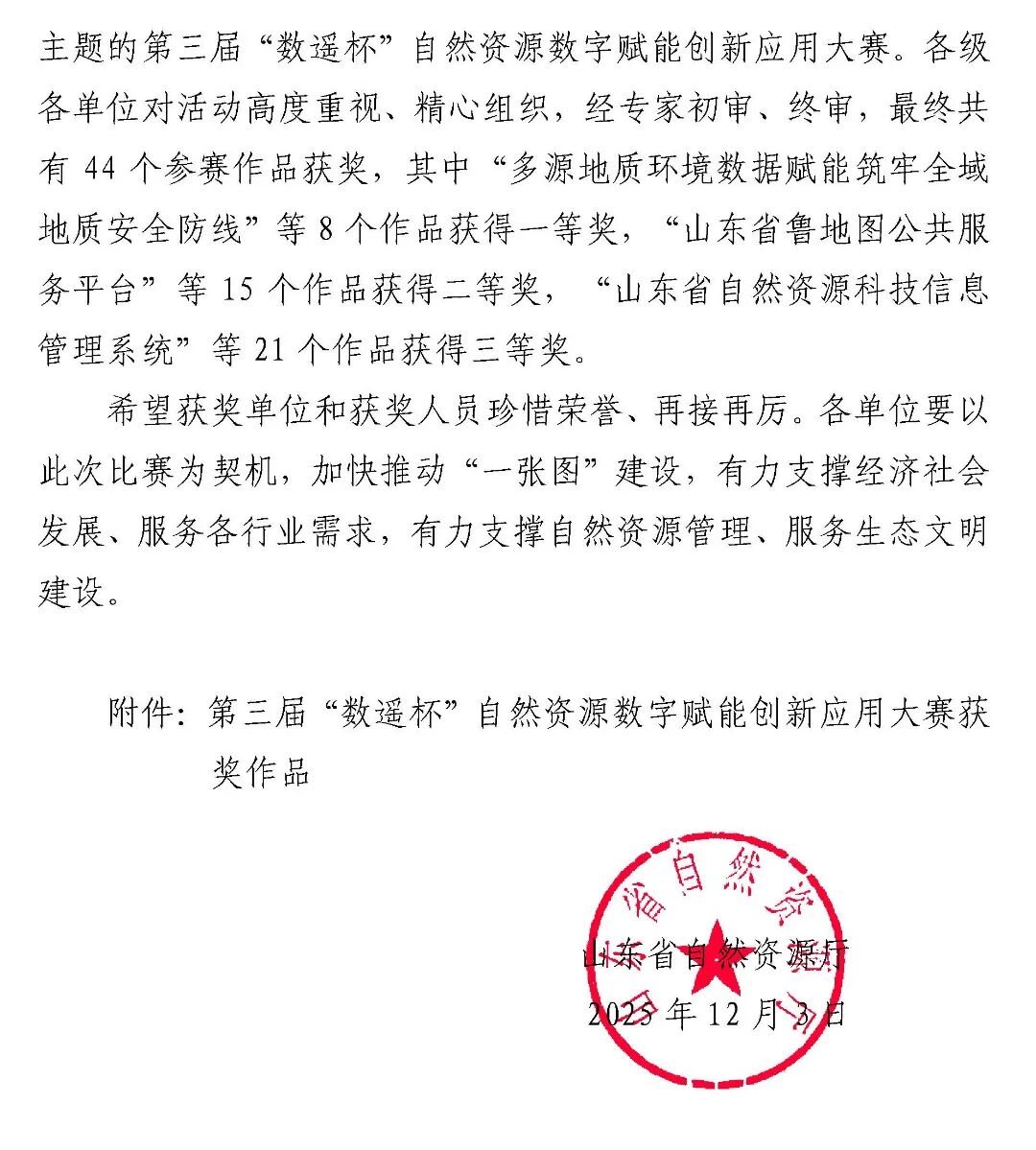 山东省第三届“数遥杯”自然资源数字赋能创新应用大赛由山东省自然资源厅组织举办,旨在通过打造一批标杆性、示范性、叫得响、用得好的创新应用场景,形成一批优秀解决方案,促进各地互学互鉴。本届大赛于9月5日启动,历经近两个月的项目征集与筛选,共有44个作品入围决赛阶段,其中一等奖8个,二等奖15个,三等奖21个。