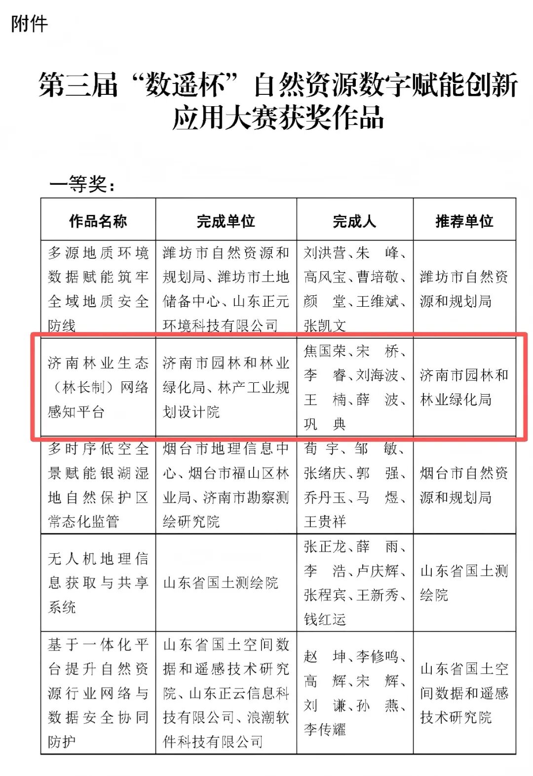 近日,山东省自然资源厅印发《山东省自然资源厅关于公布第三届“数遥杯”自然资源数字赋能创新应用大赛获奖作品的通知》,《济南林业生态(林长制)网络感知平台》凭借“技术+场景”的深度融合优势,历经海选、现场汇报、系统演示、专家答辩多轮激烈比拼,成功斩获一等奖,为全省自然资源领域数字化转型提供了实践参考。