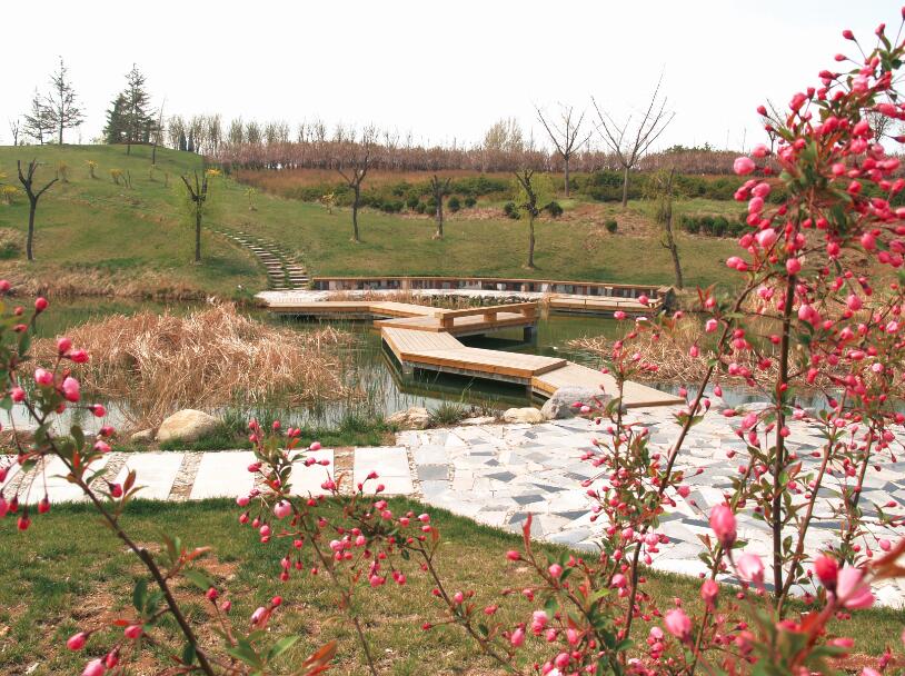 该园立意上以“大视野、大绿化、亲水性”为主,突出了“绿、水、石、景、桥”五大特色。整个植物园依托自然地形地貌,因地就势,以植物观赏、苗木繁育为主,按照植物季节变化为特点,建设了群芳竞秀、烟波乐处、黛色飞红、松壑云泉四个以反映春、夏、秋、冬植物景观为主的景区。